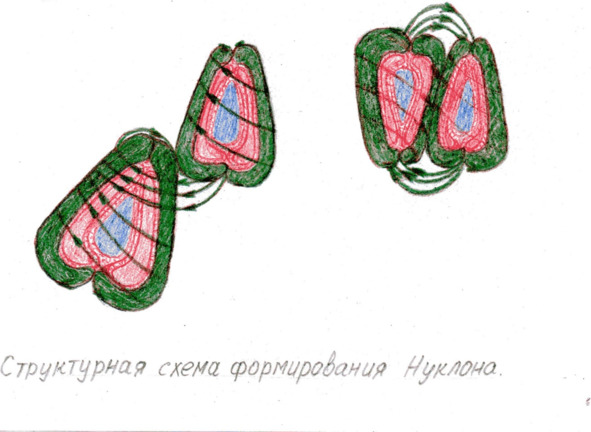 В соответствии с предлагаемой версией Нуклон образуется, практически, путём объединения двух Протонов, при этом один из Протонов превращается в Нейтрон.