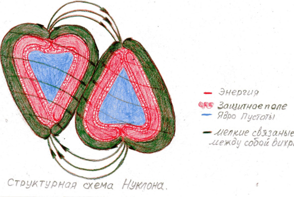То есть структура приобретает положительный заряд, определяющийся направлением вращения Электрона в обратную от него сторону, принятым как соответствующим его отрицательному заряду. При этом, как отмечалось, НУКЛОН находится в возбуждённом состоянии. Для его энергетической сбалансированности необходима крупная вихревая структура для установления баланса внутриядерных сил. Эту роль, как известно, выполняет Электрон. Без такой балансировки Электроном в атоме время жизни свободного НУКЛОНА равно около 880 секунд, то есть чуть меньше четверти часа. В атоме же он стабилен.