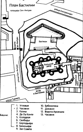 Феодальные крепости и замки обыкновенно являлись и тюрьмами. Внутреннее устройство Бастилии вполне отвечало этому назначению. Места заключения были устроены в ее башнях и под ними. Верхние тюрьмы представляли собой довольно просторные комнаты с небольшими окнами, в которых были вмурованные железные решетки. Условия содержания в них были весьма сносные и не шли ни в какое сравнение с нижними тюрьмами, находившимися на глубине шести метров под уровнем двора – свет и воздух едва проникали туда, сырые стены никогда не просыхали. Парижане называли их cachots [2]. Всего, при условии размещения по одному заключенному в каждой камере, Бастилия могла вместить сорок два узника.