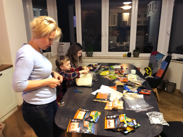 While packing my things at home, continuing to struggle with excess weight, my family and I poured the sublimates out from heavy foil packs into cellophane zip bags, then sorted and packaged dried fruits by weight.