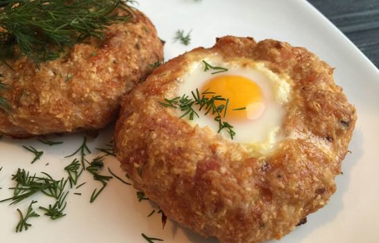 В каждое углубление вылить сырое перепелиное яйцо. Можно запечь котлеты до полуготовности и потом вылить яйца (желток будет ярче).