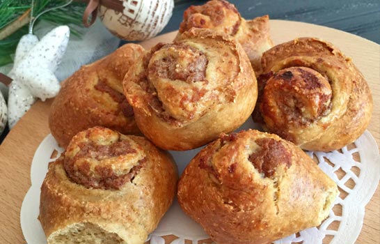 Все ингрединты смешиваем. Вымешиваем тесто руками и отправляем в холодильник на 20 минут. Тем временем готовим начинку – все ингредиенты смешиваем. Достаем тесто, раскатываем тонким, прямоугольным пластом. С одного края и до середины выкладываем начинку, закручиваем «колбаской» и режем на несколько «порций» шириной около 2 см. Получается 8-9 штук. Отправляем выпекаться при 180 градусах около 25 минут.