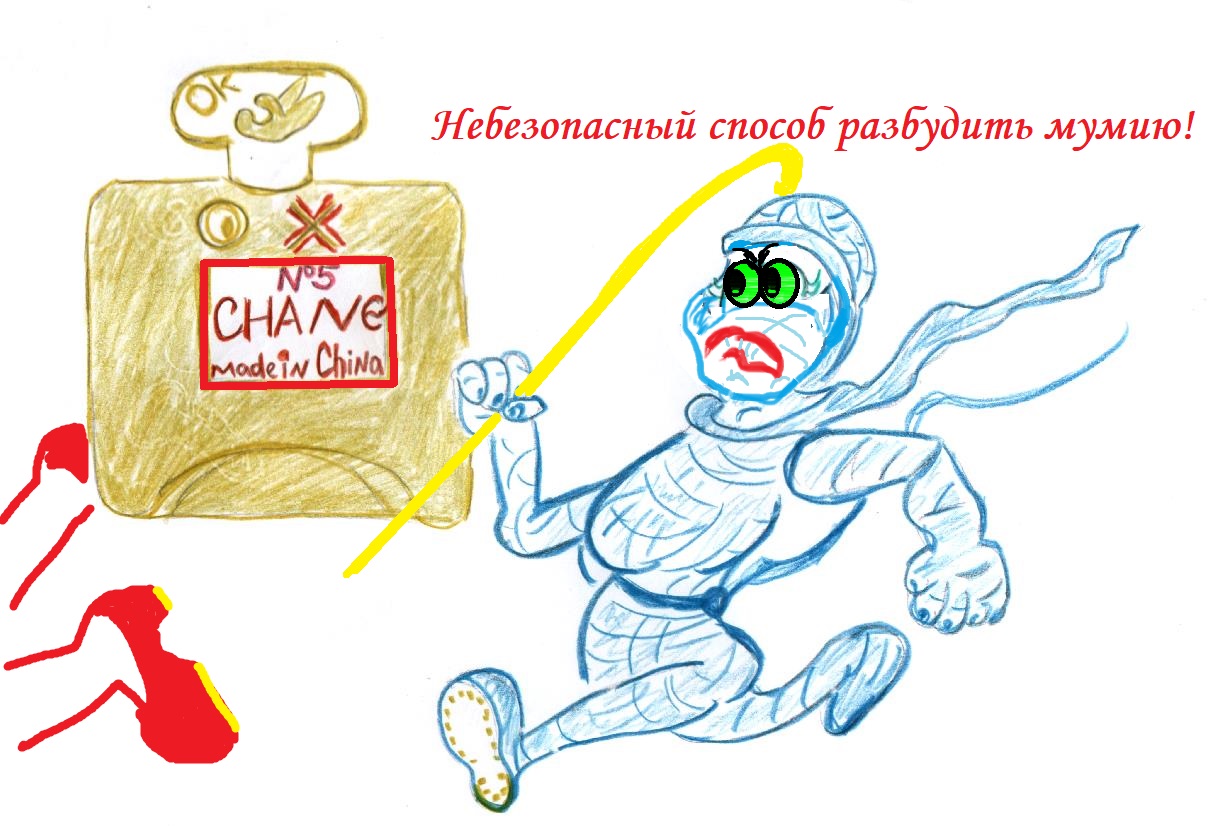 Мумия, злобно чихая и кашляя от вони, но, не забывая при этом вопить злобные пожелания и размахивать жезлом, неслась следом.