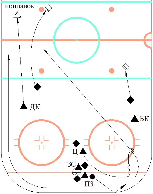 Если соперник откатывается или ввиду его не плотного построения в наступлении есть чистый лёд, то либо поплавок, уверенно приняв шайбу, делает обратный пас защитникам, свободным от опеки, либо коротким перепасом, начав выход, в итоге уводят шайбу за свои ворота.