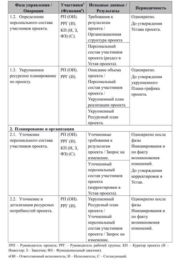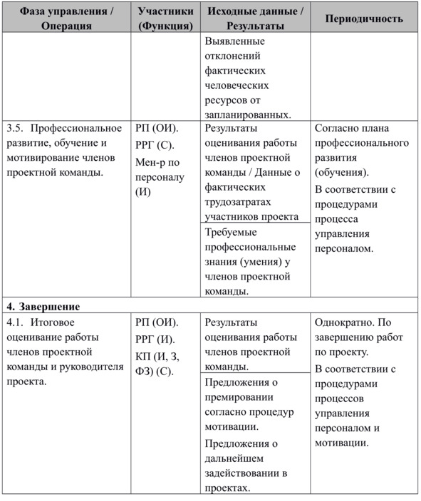 Описание основных операций группы управления человеческими ресурсами в проекте (сгруппированные по фазам управления) приводится в Табл. 3.4.