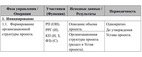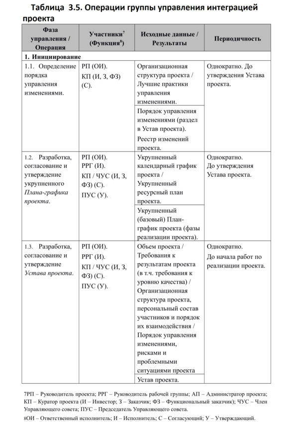 Описание основных операций группы управления интеграцией проекта (сгруппированные по фазам управления) приводится в Табл. 3.5.