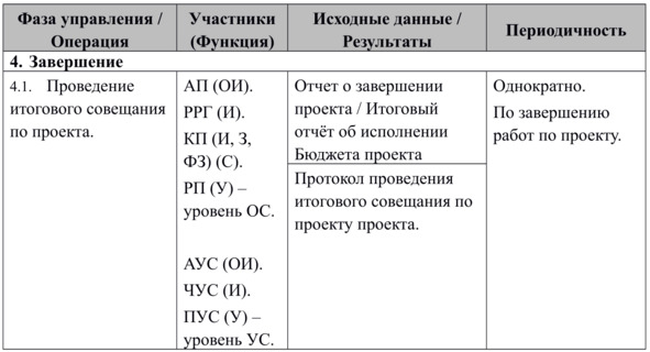 По завершению работ по проекту Руководитель проекта проводит итоговое совещание по проекту, на котором рассматривается Отчет о завершении проекта (см. Приложение 13.) и Итоговый отчёт об исполнении Бюджета проекта (см. Приложение 9.).