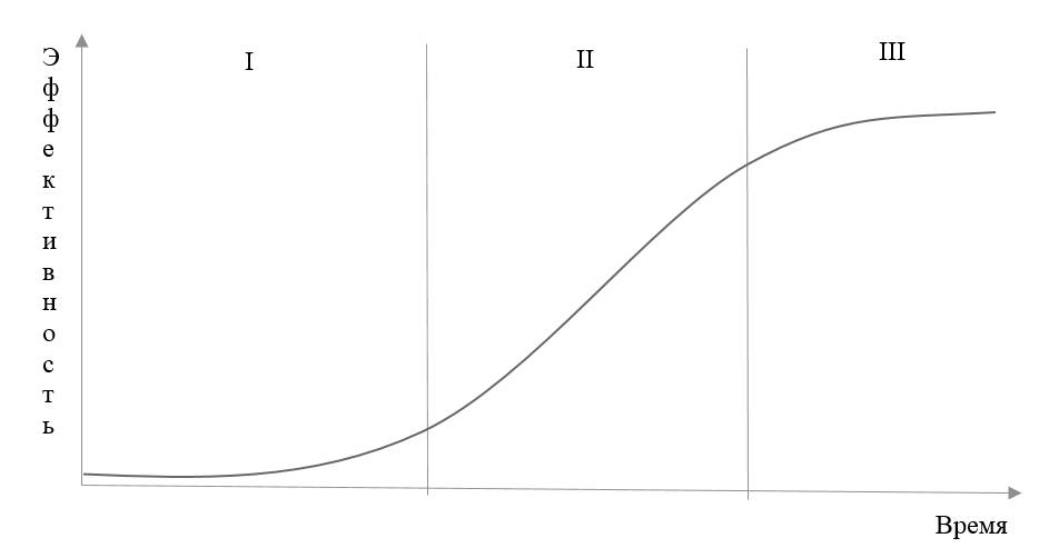 Функция результативности имеет индексы i и k, т.к. для каждого человека i она индивидуальная, и для каждой сферы жизни k она тоже отличается, но общий характер функции результативности для всех одинаков и носит параболический характер с выходом на горизонтальный участок.