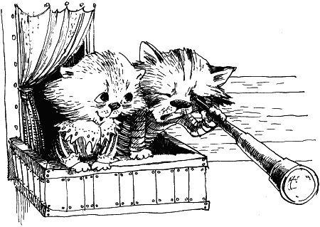 Дорога домой – это всегда здорово. Кошачье войско двигалось прямо в столицу, а Румпель с паном Коржиком завернули к домику-фрегату. Встреча была самая радушная. Пани Румпелева накрыла такой стол!.. Весь вечер ушел на рассказы о чудесных приключениях Рыжего и Полосатого. Самих котят отправили спать пораньше, а их родители засиделись допоздна. По-видимому, Румпель с Коржиком слишком увлеклись старым ямайским ромом: когда наутро Полосатый спустился вниз, то собутыльники спали, как суслики, сидя за столом и опустив головы на лапы. Усталая пани Румпелева пока не вставала. Полосатый покружил по дому, выискал в буфете пару сушеных рыбок и, безуспешно попытавшись растолкать адмирала, пошел будить Рыжего. Однако Рыжий брыкался и ворчал, что вставать в такую рань могут только психи ненормальные. А для Полосатого подъем в пять утра был совершенно нормальным делом. Поэтому он быстро сбегал на кухню и, набрав в рот воды из чайника, поднялся наверх и прыснул на Рыжего. Коржик-младший с воплем выскочил из кровати и бросился догонять Полосатого. Так они с визгом и криками гонялись друг за другом, швыряясь тапочками и полотенцами, пока не вылетели кубарем на маленький балкон. Румпель называл его «капитанским мостиком». Здесь друзья уютно уселись на перилах и, болтая лапками, сгрызли по рыбке. Рыжий посмотрел в сторону замка: