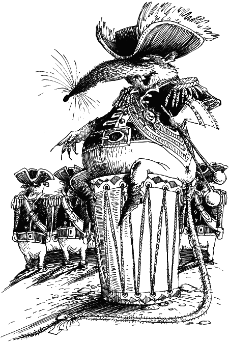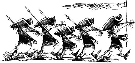 Наконец адмирал, пан Коржик и их сыновья, вытерев слезы, двинулись в сторону столицы. И очень скоро они увидели боевые части крыс. Рыжий с Полосатым видели этих тварей впервые. Это вам не печеные мышки! Перед котами шла не разбойничья шайка, не бестолковая толпа, не объединенная бандитская группировка. Это была – армия! Собранная, обученная, организованная, дисциплинированная, умеющая маневрировать, нападать и отступать, безропотно выполняя все приказы командиров. Страшный живой механизм войны! Все крысы носили черные треуголки, красные эполеты и широкие черные ремни, на перевязях болтались короткие шпаги, а на плечах качались копья. Войско казалось неисчислимым…