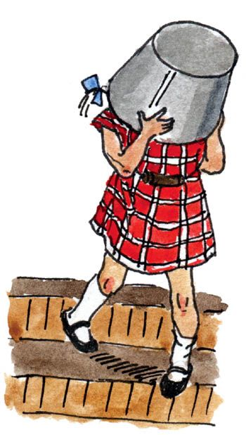 – Ну-ка, поставь ведро и принеси мне, пожалуйста, молоток, – попросил дедушка. – В ведре ходить небезопасно, можно упасть, вон уже коленку разбила.