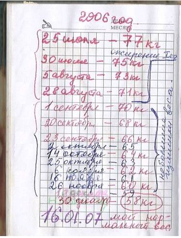 На фото выше – моя мама. Слева 78кг. Справа 58кг. Ниже фото блокнота с записями нашего пути: