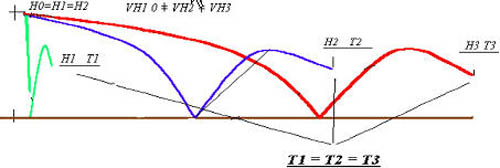 This means that in a vacuum all things, even if their weight is different, fall to the ground with identical velocity (see the comparison between a feather and a ball). This law holds valid independent of an inertial system moving at a constant speed. What does this mean? A ball which is dropped from a certain height falls with the same velocity as a ball which is dropped from the same hight inside a moving train. An outside observer, however, does not see the vertical fall, but a throwing/flying parabola if the train moves at a constant speed. This is the principle of the independence of translation movements. The importance of the invariance of gravitation and the independence of translation movements can be illustrated by a further example. In figure 2, three ballistic ball curves with different horizontal velocities are shown. The balls are shot off horizontally at the same time, the curves having an identical maximum.