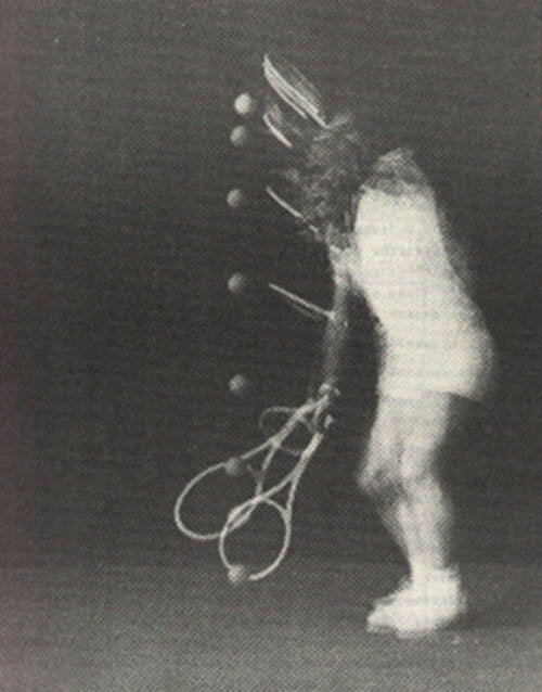 It needs no further consideration to identify the ball as the object which the tennis player must focus his eyes on and which he must observe (figure 1). in spite of this, the teaching method which is still used today pretends that the ball does not exist. Although all the player's movement sequences are described in detail, he is kept 'blind'. The instruction "Look at the ball!" only shows the uselessness of this method, which does not make it possible to relate the player's movement form to his perception, which takes place simultaneously. Only if it were possible to establish this relation between the movement of the racket face and the movement of the ball, would the demand to consider perception and movement always as a unit be fulfilled. This means that the movement of the racket face must be related to the movement of the ball, which is the object of perception as far as space and time are concerned. Thus, timing is placed at the centre of attention!