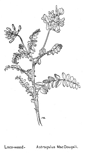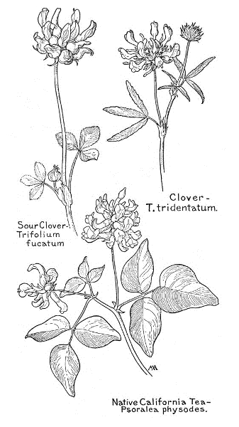 This has queer-looking flowers and is conspicuous on that account. The branching stems are a foot or more tall, the stipules are large, with papery margins, and the leaves are bright green, with a paler spot near the middle of each of the leaflets, which are toothed, or sometimes only bristly on the edges, and the flowers form a head about an inch and a quarter across, with a broad involucre. The calyx is very small and the corolla is cream-color, becoming much inflated and changing to deep pink as the flower withers. The effect of the cluster is curiously puffy and odd in color. This grows rankly in low alkaline and brackish places.