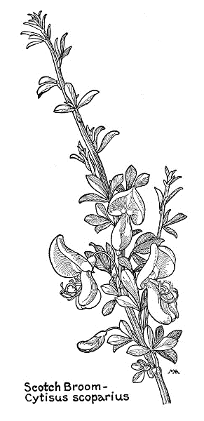A handsome branching shrub, about five feet high, with almost smooth or quite hairy leaves, with three, toothless leaflets, and fine clusters of flowers, each an inch or more long, with a yellow two-lipped calyx and a golden-yellow corolla, deeper in color at the base of the standard and at the tips of the wings; the stamens ten, in one set; the style curved in. The pod is flat, smooth on the sides, but hairy along the edges, one or two inches long and curling when ripe. This is said to have been brought to California by Cornish miners.