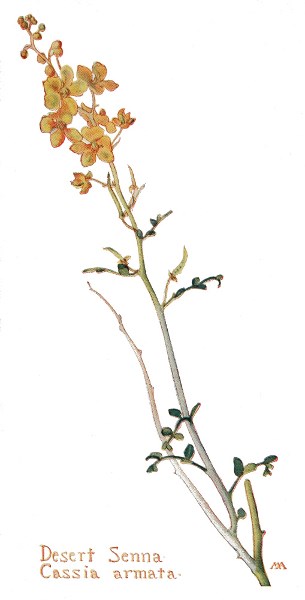 The peculiar orange-yellow of these handsome flowers at once attracts our attention, for their tint is quite different from the greenish-yellow, which is so much more common. They grow in the desert, forming big clumps, two feet high and two or three feet across, but have almost no foliage. The numerous, smooth stems are very pale in color, often bluish or gray, with a few dark-green leaves, with six, very small, stiff leaflets, and bearing clusters of numerous, sweet-smelling flowers, almost regular and about three-quarters of an inch across, with a downy calyx and the small, flat pod also downy.