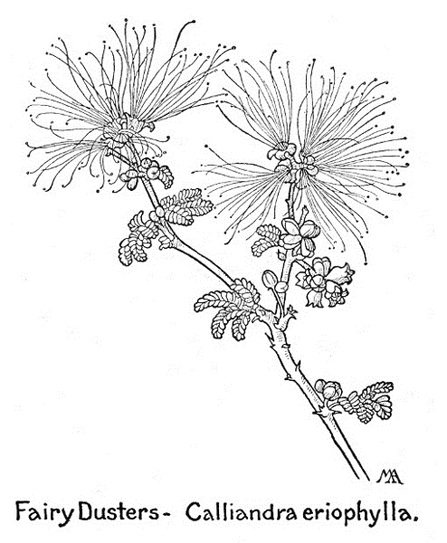 An odd little shrub, pretty and very Japanese in character, about a foot tall, with a few, pale-gray, spreading branches and very scanty foliage. The small leaves are cut into many tiny leaflets and look like those of a Mimosa, the buds are deep pink and the flowers are in clusters towards the ends of the branches and slightly sweet-scented. They are very queer-looking, but exceedingly pretty, for the purplish calyx and corolla are so small that the flower appears to be merely a tuft of many stamens, about an inch long, with threadlike filaments, white at base and shading to bright pink at the tips. The pistil is also long and pink, so the whole effect is a bunch of pink fuzz, airy in form and delicately shaded in color. These little shrubs sometimes bloom when they are only a few inches high, looking very quaint, like dwarf plants in a toy garden, and are among the earliest spring flowers.
