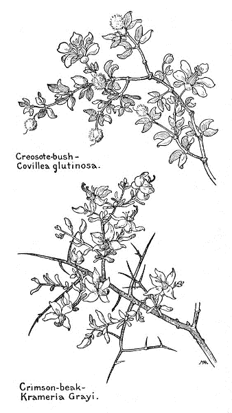 A graceful, evergreen shrub, common in arid regions and a characteristic feature of the desert landscape, filling the air with its very strong, peculiar odor. It is from three to ten feet high, with many little branches, with blackish knots at the joints, clothed with sticky, dull yellowish-green foliage, the thickish, resinous leaflets very small, in pairs, with almost no leaf-stalk, and uneven at base. The pretty flowers are nearly an inch across, with bright yellow petals, with claws, and silky, greenish-yellow sepals which soon drop off. The filaments are broadened below into wings and have a scale on the inner side. The ovary is covered with pale, silky hairs, so that the older flowers have a silky tuft in the center, and becomes a round, densely hairy fruit, with a short stalk, tipped with the slender style. These little white, silky balls of down are very conspicuous and, as they are mingled with yellow flowers, the bush has an odd and pretty effect of being spotted all over with yellow and white.