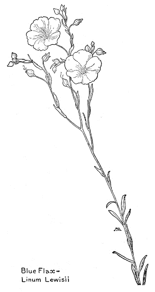 An attractive plant, from one to two feet tall, with several, erect stems, springing from a woody, perennial root, with numerous, small, narrow, bluish-green leaves and loose clusters of pretty flowers, each about an inch across. The petals, delicately veined with blue, vary in tint from sky-blue to almost white, with a little yellow at the base. This is common and widely distributed, from Manitoba to Texas and westward, but the fiber is not strong enough to be used commercially.