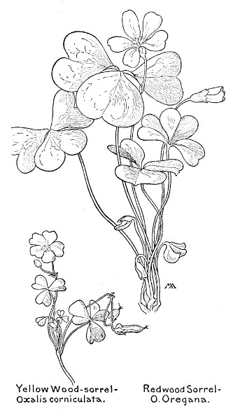There are many kinds of Oxalis. The Greek name means "sour," in allusion to the sour taste of these plants, which contain oxalic acid. The leaves are alternate, at nightfall the leaflets droop and fold together; the stamens are ten, five long and five short, all with anthers, with filaments broadened and united at base.