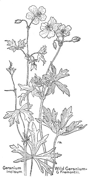 In the Sierra woods, and along Yosemite roadsides, in summer we see the purplish-pink blossoms and nodding buds of this attractive plant, resembling the Wild Geranium of the East, growing from thick, perennial roots, with hairy, branching stems, from one to two feet high. The hairy leaves, with three or five, toothed lobes, are fragrant like cultivated geraniums; the flowers, over an inch across, are hairy inside, the petals veined with magenta. They are occasionally white and the plants vary in size and hairiness. G. furcàtum, of the Grand Canyon, has magenta petals, which turn back more.