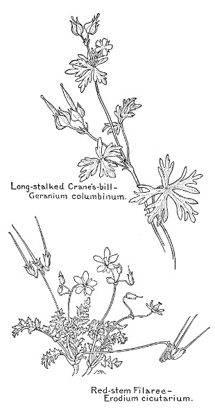 There are many kinds of Geranium; stems with swollen joints; stipules papery; five glands on the receptacle, alternating with the petals; stamens ten, five long and five short, filaments united at base; ovary with a beak formed by the five-cleft style, and becoming a capsule, which splits open elastically, the style-divisions becoming tails on the seeds. The Greek name means "crane," in allusion to the long beak of the capsule, and these plants are often called Crane's-bill. Cultivated Geraniums are Pelargoniums, from South Africa.