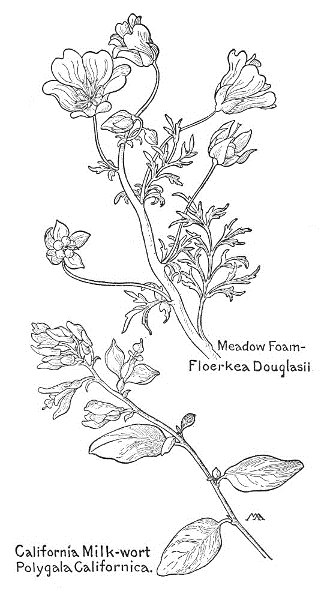 Though not native, this is the commonest kind, in the interior and semi-arid regions, and most valued for forage. When young it forms rosettes close to the ground, but grows taller and more straggling. The stems are often reddish; the leaves somewhat hairy; the flowers small, in clusters of four to eight, with four bracts at the base; the petals purplish-pink, with darker veins, and hairy at the base, the two upper petals slightly smaller; the sepals tipped with one or two bristles. The ovary is beaked by the united styles, the beak, when the seeds ripen, separating into five, long tails, which twist spirally when dry and untwist when moistened. This is common west of the Rockies, blooming more or less all the year round, varying in size in different soils. Filaree is a corruption of the Spanish Alfilerilla, from "alfiler," a "pin." Other names are Pinkets, Pinclover, Storksbill, and Clocks, so-called by children because they amuse themselves by watching the tails twist about like the hands of a clock. White-stem Filaree, E. moschàtum, common in rich soil, has larger, coarser leaves and a faint scent.