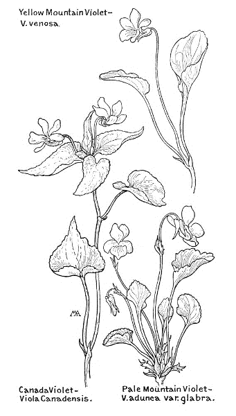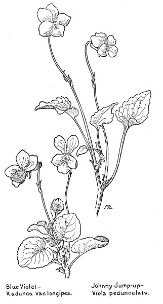 Charming flowers, often growing in quantities on open hillsides. The leafy stems are from two to six inches high, the leaves rather dark green and the scentless flowers, about an inch across, have bright golden petals, with some purple lines at the base of the three lower ones, the spur and upper petals tinged with brownish-purple on the outside, the two side petals hairy at base inside, and the stigma hairy. The Spanish-Californian name is Gallito. There is no technical difference between Pansies and Violets.