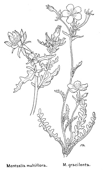 There are many kinds of Mentzelia, all western, often with white shining stems and alternate leaves; the calyx cylindrical or top-shaped, with five lobes; the petals five or ten; the styles three, somewhat united. The barbed hairs which clothe the stems and leaves make the plant stick to whatever it touches, probably helping to distribute the seeds, hence the common name Stick-leaf.