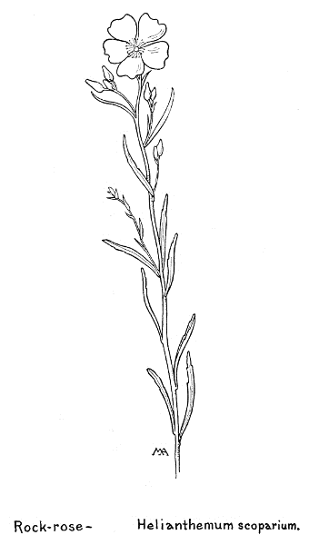 There are many kinds of Helianthemum, widely distributed, perennials; leaves alternate, undivided, toothless; flowers yellow and, in most North American species, of two sorts; the earlier ones with large, yellow petals, very numerous stamens and a many-seeded pod; the later ones, small, clustered, with small petals or none, three to ten stamens, and small, few-seeded pods.