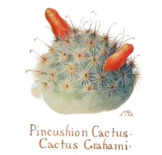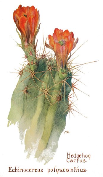 A quaint little plant, often no bigger than a billiard ball, with long, blackish, hooklike spines, projecting from stars of smaller spines. The flowers are pink and the berries are smooth, fleshy fingers of brightest scarlet, edible, pretty and odd. Sometimes we see one of these prickly little balls peeping from under a rock and again we find them growing in a colony, looking much like a pile of sea-urchins. This grows in the Grand Canyon, and there are similar kinds in southern California.