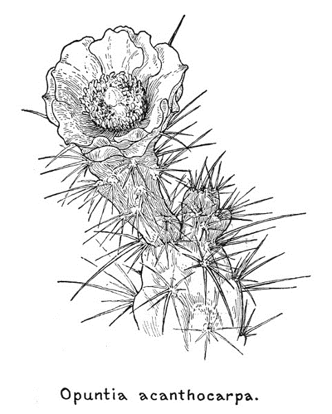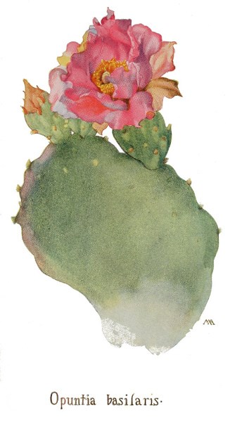 Low plants, with no main stem, with spreading, flattened branches, the joints of which are flat disks, resembling fleshy, bluish-green leaves. These disks are half an inch to an inch thick and six inches long, more or less heart-shaped, sprouting one out of the other, at unexpected angles. The beautiful flower is about three inches across, like a tissue-paper rose, pale or very deep pink, with a whitish pistil, yellow anthers, and crimson filaments. The joints have a strong fishy smell, when cut, and are dotted with tufts of small, brown bristles, exceedingly unpleasant to get in one's fingers. This is rare and grows at the Grand Canyon. Prickly pears usually have yellow flowers and long spines.