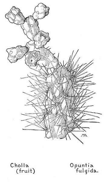 A horrible shrub, or dwarf tree, four to six feet high, with a thick trunk and several, spreading, contorted branches, with cylindrical joints, twisting in awkward ways. The trunk and larger limbs are brownish-gray, starred with dead, dry spines, but the twigs are pale bluish-green, covered thickly with stars of pale-yellowish spines, each an inch or so long, with a barbed tip. From the numerous magenta flowers strange, yellowish, cup-shaped fruits develop, seeming to spring one out of the other in a haphazard way, hanging in long chains, awkward but rather ornamental, and remaining on the plants for several years without change, except that they grow slightly larger. The distant effect of this plant is a pale, fuzzy mass, attractive in color, giving no hint of its treacherous character – more like a wild beast than a plant! The joints suggest a very ferocious chestnut-burr and break off at a touch, thrusting their spines deeply into the flesh of the unwary passer-by, so that the Indian story, that this plant flings its darts at wayfarers from a distance, might almost as well be true, and the barbs making the extraction difficult and painful. The ground under the plants is strewn with fallen joints, which take root and propagate themselves. Small animals pile these around their holes for defense, several kinds of birds build in the thorny branches and are safe from enemies, and the fruits, being spineless and succulent, are valuable for fodder, so the Cholla is not entirely malevolent. The name is pronounced Choya. There are many similar kinds, some with very handsome rose-like flowers, others with bright scarlet fruits. They are curious and interesting inhabitants of the desert.
