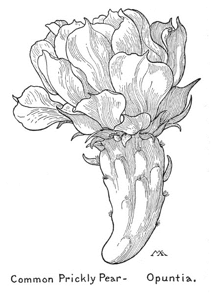 There are fifty or more common kinds of Prickly Pear, many of them as yet undescribed and little known. They have flattened joints and yellow flowers, like the one illustrated, which is typical, often measuring three or four inches across, the petals variously tinted outside with salmon, rose, and brown.