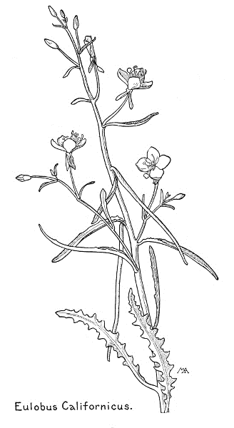 This is the only kind of Eulobus. It would be a pretty plant, if more flowers were out at one time and if they did not close so soon. The smooth, hollow, loosely-branching stem is from one to three feet tall, with a "bloom," the leaves are smooth, rather light dull-green, and the buds are erect. The flowers are about three-quarters of an inch across, with a very short calyx-tube, light-yellow petals, fading to reddish-pink, eight stamens, four of them smaller and shorter, and the light-green stigma with a round top. The slender pods are three inches long, smooth, cylindrical, and turning stiffly down, with many seeds. This grows in mountain canyons.