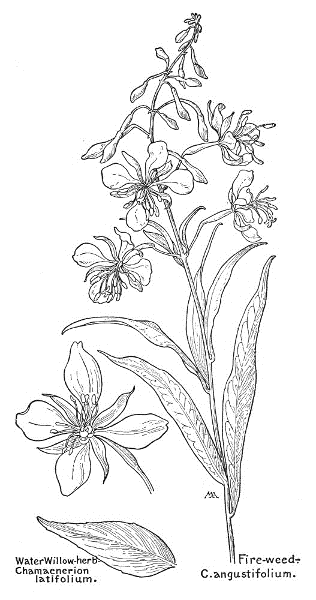 A striking and decorative perennial, from two to six feet tall, with alternate leaves, pale on the under side, the veins making a scalloped border near the margin, the upper leaves and stems sometimes slightly downy, and the drooping buds deep reddish-pink or purple. The flowers form a fine cluster, with small bracts, each flower an inch or more across, the sepals often pink or purple and the petals bright purplish-pink; the stamens drooping, with purplish anthers; the style hairy at base, the capsule two or three inches long. This is very common, both East and West, reaching an altitude of ten thousand feet, and often growing in such quantities in the mountains as to cover large tracts with bright color. The seeds are furnished with tufts of white, silky hairs, making the plant very conspicuous when gone to seed, covering it with untidy bunches of pale down and giving a strange shaggy effect. It often flourishes in places that have been burned over, hence the name Fire-weed, and Willow-herb is from the leaves and the silky down on the seeds, suggestive of willows.