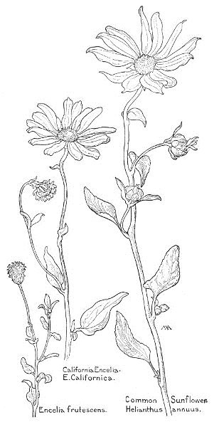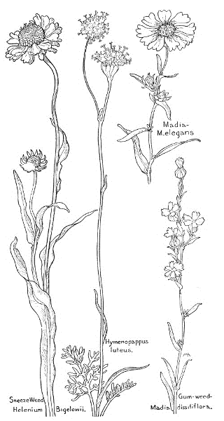 Pretty flowers, with hairy stems, from six inches to three feet tall, and velvety or hairy leaves, more or less sticky and the upper ones alternate. The flowers grow in loose clusters and are from one to over two inches across, with bright yellow rays, sometimes with a spot of maroon at the base which gives an extremely pretty effect, and a yellow or maroon center. This often makes pretty patches of color in sandy places, and is widely distributed and very variable. Woodland Madia, M. madioìdes, is similar, but not so pretty.
