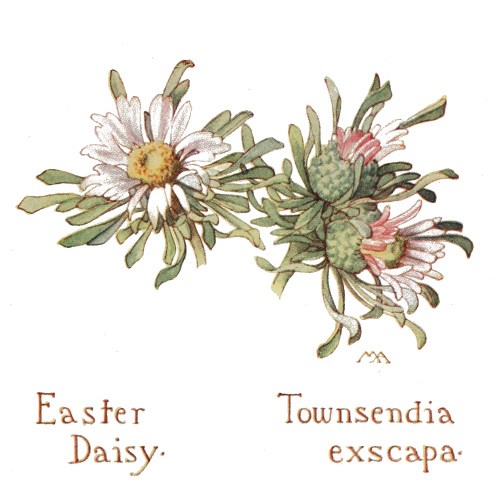 This is a charming and quaint little plant, with close, downy rosettes of small, gray-green leaves and two or three, pretty, daisy-like flowers, all crowded together close to the ground. The flowers are over an inch across, with numerous, pale-pink rays, deeper pink on the under side, and a bright yellow center, and when they bloom in early spring, on bare rocky soil, they are exceedingly attractive.