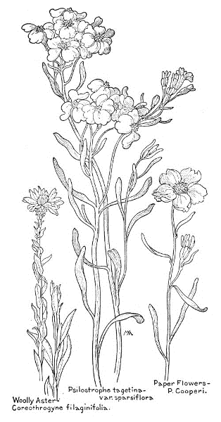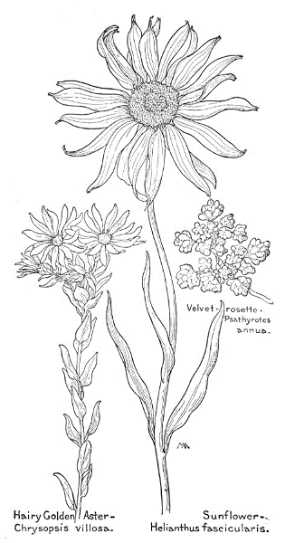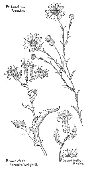 A curious and pretty little desert plant, that looks as if it were trying to protect itself from cold rather than heat, as its pretty foliage and stems seem all made of silvery, gray velvet, forming a symmetrical rosette, dotted with the small, rayless, yellow flower-heads, like fuzzy buttons. The rosette is decorative in form, about a foot across, spreading flat and close to the ground, and is conspicuous on the bare sand of the desert. Only one of the branches is given in the picture.