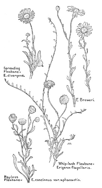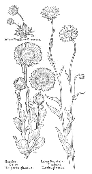 A pretty perennial, from one to three feet tall, usually soft and hairy, the slender stems usually branching above and most of the leaves toothed. The flowers usually form a loose cluster at the top, the buds drooping, and the heads are from half an inch to an inch across, with yellow centers and a very feathery fringe of pink or pinkish rays. This grows in fields and woods. There is a picture in Mathews' Field Book. E. Còulteri, the large White Mountain Daisy, is a beautiful kind, from six to twenty inches tall, with bright green leaves, often toothed, sometimes downy, and the flowers usually single, an inch and a half across, usually with pure white rays. This grows in Yosemite meadows and similar mountain places, in Utah, California, and Colorado. E. compósitus is a little Alpine plant, forming dense leafy mats, easily recognized by the broad tips of the leaves being cut into lobes, usually three. The flowers are an inch or more across, with violet or white rays. This grows on the granite peaks around Yosemite, and in other Alpine regions, as far east as Colorado.