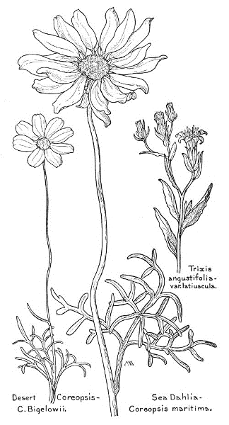 There are many kinds of Coreopsis, natives of America, South Africa, and Australasia, several of them cultivated in gardens. They are called Tickseed.