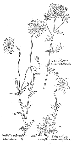 This is from eight to fifteen inches tall, with pretty flowers, an inch and a half across, with bright yellow rays and deep yellow centers, contrasting well with the pale gray-green foliage, which is covered with close white down. This grows in arid situations on the mesas and often forms clumps.