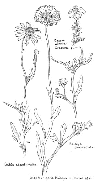 A quaint little desert plant, only two or three inches tall, with thickish, pale gray-green leaves, covered with close white down, and pretty little flowers, growing singly at the ends of tiny branches, each half an inch across, with a yellow center and pure white rays, which fold back at night. These little flowers are too small to be very conspicuous, but are charming in effect, sprinkled over the bare sand, and when growing in quantities on nearly bare mesas give a whitish appearance to the ground.