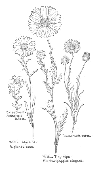 This is a dear little plant, often covering the fields with a carpet of gold. The slender stems are about six inches tall, with soft, downy, light green leaves, usually opposite, and pretty fragrant flowers, about three-quarters of an inch across, with bright yellow rays and darker yellow centers. This is sometimes called Fly Flower, because in some places it is frequented by a small fly, which is annoying to horses. B. macrántha is a much larger plant, a biennial, with a tuberous root, from seven inches to a foot and a half tall, with long, narrow, toothless leaves, with hairy margins, and flower-heads from an inch to an inch and a half across, with yellow rays and hairy involucres. This grows along the coast in California, blooming in May and June.