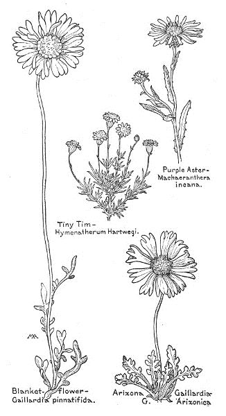 This is handsome and conspicuous, with a slender, rough stalk, about a foot tall, dull green, stiff, rather hairy leaves, mostly from the root, and beautiful flowers, an inch and a half across, with golden-yellow rays, with three teeth, and a center of shaded maroon and yellow, which is very velvety and pretty and becomes an attractive, purplish, fuzzy, round head when the rays drop off. This grows on the plains. G. aristàta, found throughout the West and as far east as Colorado, is an exceedingly handsome kind, sometimes over two feet tall, with beautiful yellow flowers, sometimes measuring four inches across.