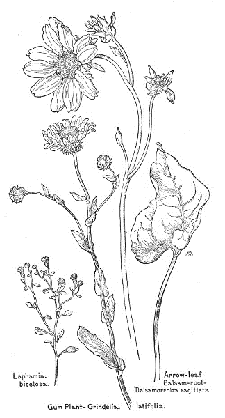 A robust and exceedingly handsome plant, one or two feet tall, with rich foliage and gorgeous flowers. The leaves are stiffish, dark rich green, smooth but somewhat sticky, often toothed; the stem-leaves alternate, their bases partly clasping, and the root-leaves a foot or two long and two or three inches broad, with leaf-stalks. The flower-heads are about four inches across, with bright yellow rays, almost orange color, and the center with three rows of yellow disk-flowers, surrounding a clump of pointed, overlapping, stiff, greenish scales in the middle. This sometimes forms immense patches on dry hills at rather high altitudes, as far east as Colorado. It is sometimes called Compass Plant, because its leaves are thought to point North and South, and the Indian name is "Pe-ik."