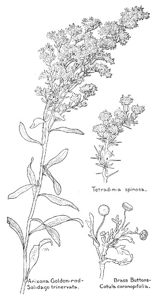 A handsome kind, from one to two feet high, with flower-heads nearly three-eighths of an inch across, with bright yellow rays and centers, forming a large, handsome, plume-like cluster. The stem and leaves are dull bluish-green, rather stiff and rough, the lower leaves with a few obscure teeth. This grows at the Grand Canyon. S. occidentàlis, Western Golden-rod, is smooth all over, with leafy stems, from three to five feet tall, toothless leaves, and flat-topped clusters of small, yellow, sweet-scented flowers. This grows in marshes and along the banks of streams, in California, Oregon, and Washington, blooming in summer and autumn. S. Califórnica, California Golden-rod, is from two to four feet high, with grayish-green, roughish leaves, the lower ones toothed, and small yellow flowers, forming dense pyramidal clusters, from four to thirteen inches long. This grows on dry plains and hillsides and in the mountains, throughout California and in Oregon, blooming in the autumn. It is called Orojo de Leabre by the Spanish-Californians.