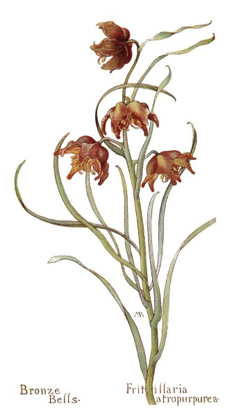 This plant is beautiful and decorative, and yet there is something weird about it. The flowers, an inch or more across, grow four or five in a cluster, on a smooth stalk about a foot tall, the long, narrow leaves scattered or in whorls. The bells, nodding on slender flower-stalks, are very unusual in coloring. They are greenish-yellow, streaked and spotted with maroon, and the long curling tips of the three-pronged pistil project like the forked tongue of an adder, so that somehow we feel that, in a previous existence, beautiful as it is now, it may have been a toad or some reptile. When we found this flower growing in the Grand Canyon, halfway down Bright Angel trail, it seemed entirely suitable to the mysterious spirit of the place. The general effect is bronze-color and the attractive name of Bronze Bells, or Mission Bells, is very appropriate. It has a small bulb of numerous, roundish scales. The pistils are often rudimentary.