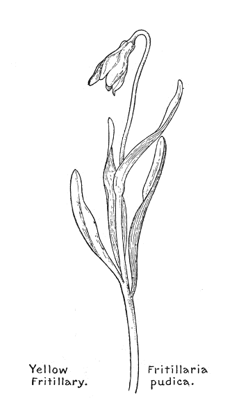 A pretty little flower, a favorite with children, growing on grassy plains, with a smooth stem about six inches tall, and smooth, somewhat thickish, alternate or whorled leaves. The nodding flowers, about an inch long, are usually single, but sometimes as many as six on a stalk, various shades of yellow and orange, tinged with crimson and fading to dull-red. The smooth bulb is pure white, and made up of a number of rounded, thickish scales not resembling grains of rice, so the name Rice Root is not appropriate and the local Utah names, Crocus, Snowdrop, and Buttercup are absurd.